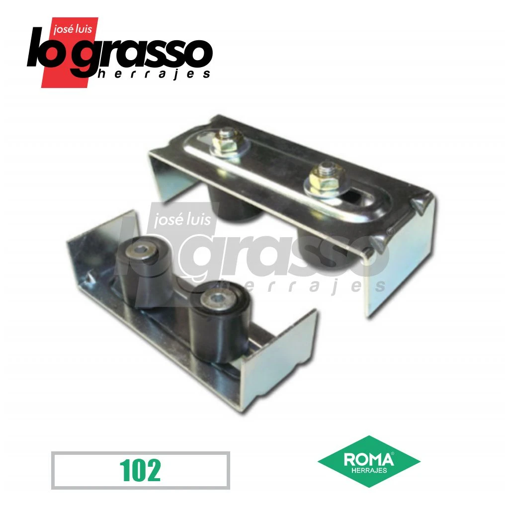 Un par de rodillos de nylon montados en pernos de acero y colocados en una estructura de chapa de 2,5mm de espesor, con nervios que le otorgan una gran rigidez y doble ranura para una regulación precisa.