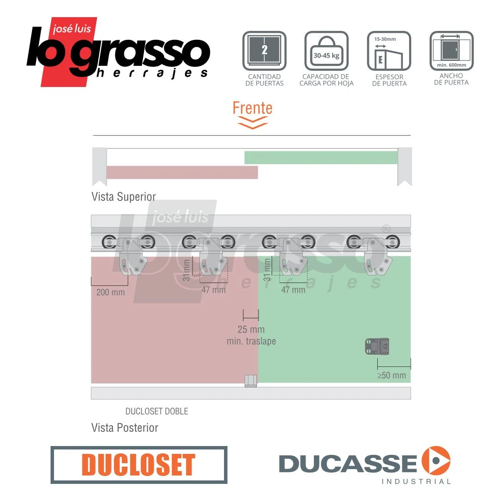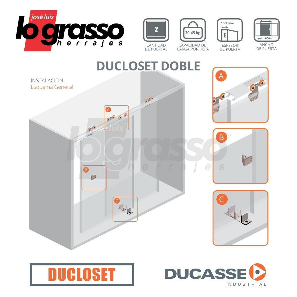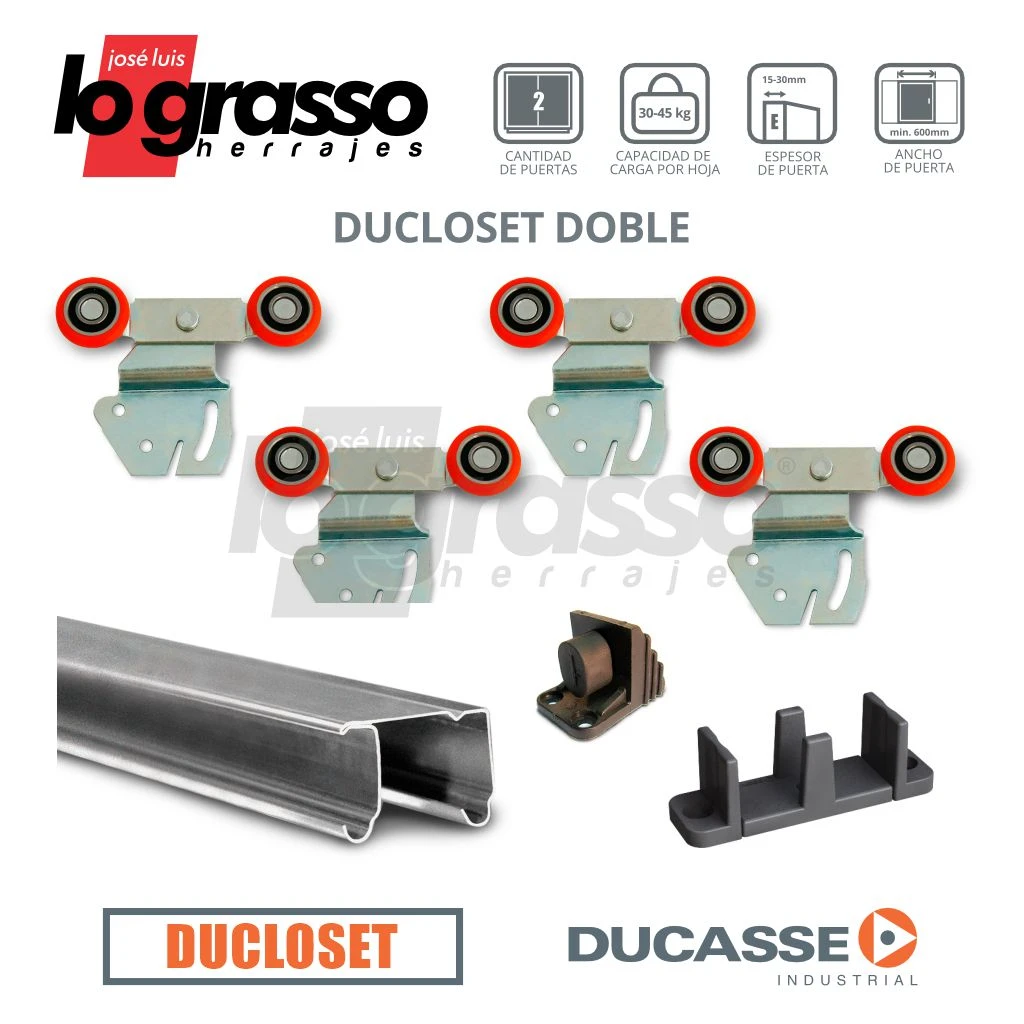 Kit Corredizo Ducloset Doble de colgar para puertas que se deslizan dentro del vano.