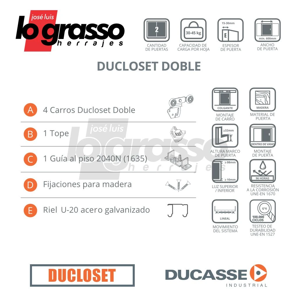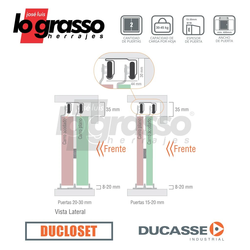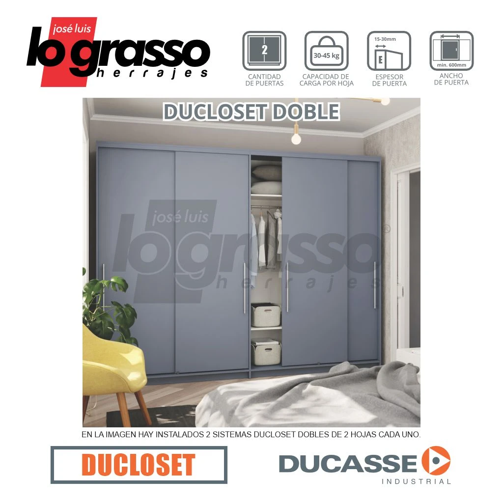Kit Corredizo Ducloset Doble de colgar para puertas que se deslizan dentro del vano.