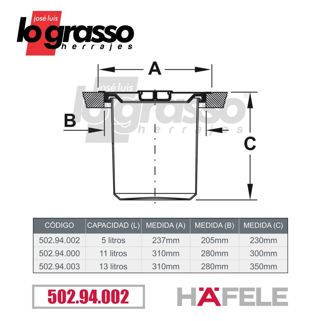 Medidas: (A) Diámetro de anillo 237mm (B) Hueco mesada 205mm (C) Alto 230mm