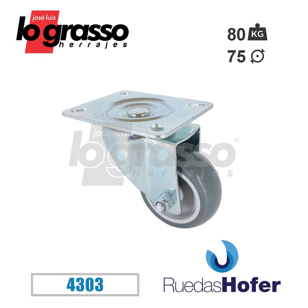 Rueda giratoria con eje liso, sin freno, con base de 4 tornillos.